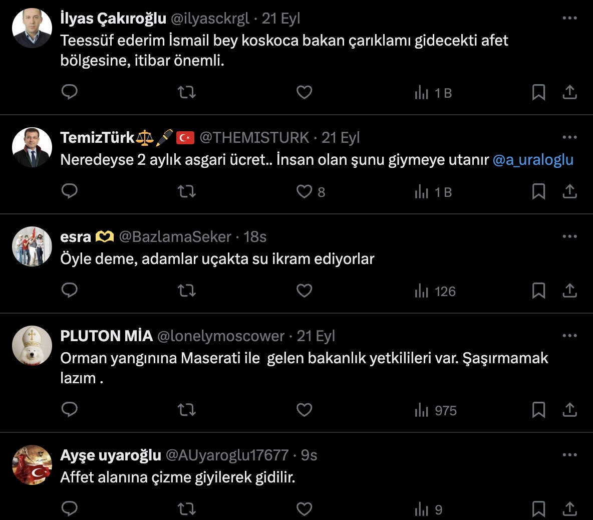 “Ulaştırma Bakanı’nın afet bölgesinde giydiği ayakkabı bu mu?” diyen Arı’nın paylaşımına gelen tepkilerden bazıları şunlar: