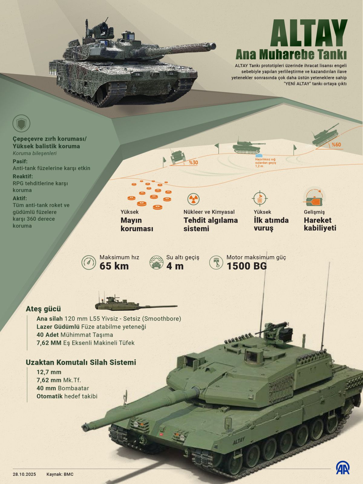 Milli ana muharebe tankı ALTAY, Türk Silahlı Kuvvetleri’ne teslim ediliyor. MKE’nin imzasını taşıyan tankın 120 mm 55 kalibre ana silah sistemini MKE üretti. Tank, NATO standartlarına uyumlu mühimmatlarla donatılmış olup 3 bin metre etkili menzile sahip. Ana silah sistemi, dakikada 6 atış yapabilme özelliğine sahiptir.
