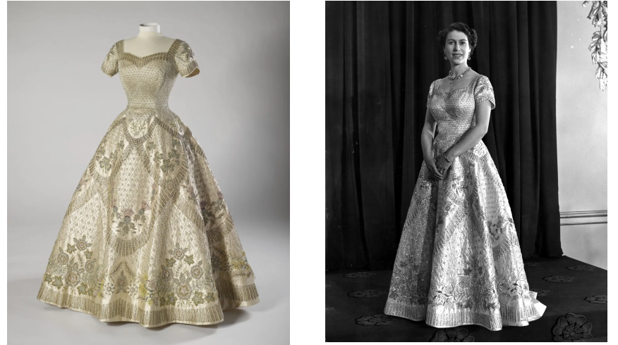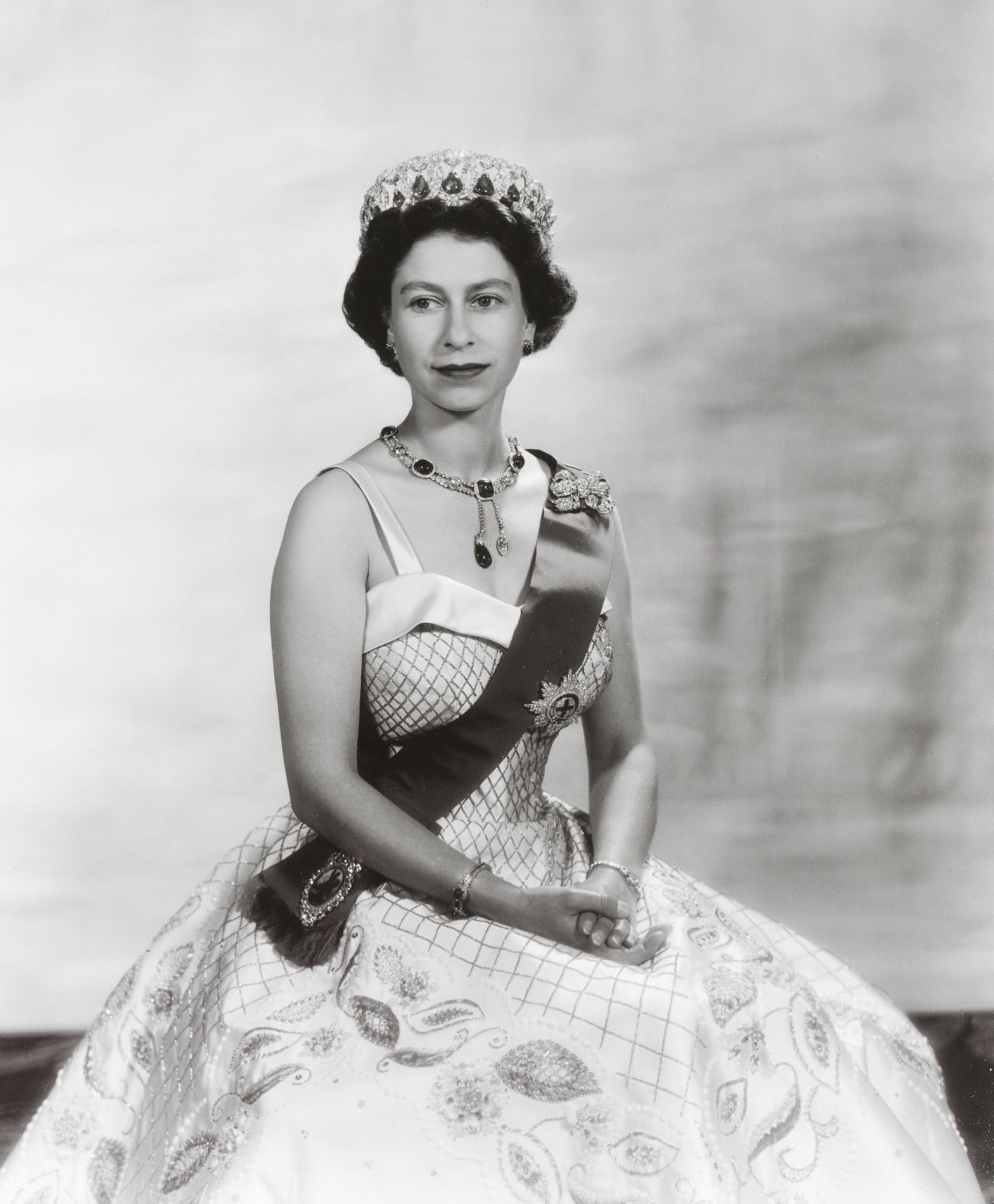 Kraliçe, 2 Haziran 1953 tarihindeki taç giyme törenindeki kıyafeti için de Norman Hartnell’i tercih etti. Elizabeth, Hartnell’den ruhu yansıtan bir elbise tasarlamasını istedi. Sonunda elbisenin dokuz farklı versiyonu ortaya çıktı. II. Elizabeth, o dönemde yönetimi altındaki her ülkeyi temsil eden çiçek amblemli saten bir model tercih etti.
