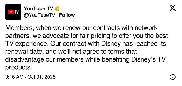 YouTube TV, resmi açıklamasını perşembe gecesi 23.16’da sosyal medya platformu X üzerinden yaptı. Şirket, lisans yenileme görüşmelerinde Disney’in sunduğu koşulları kabul etmeyeceklerini ve abonelerini dezavantajlı duruma düşüreceklerini belirtti.